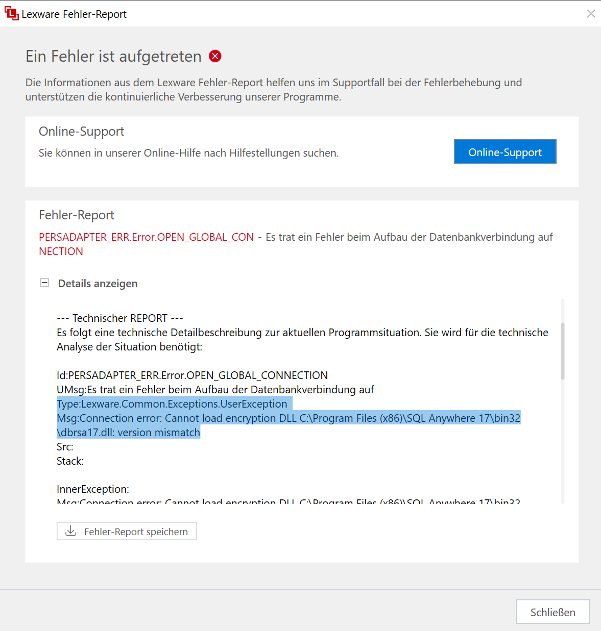 Der aktuellste Treiber von SAP (Version > 7458) verursacht in Lexware folgenden Absturz (z.B. beim Öffnen der Belege). Dies tritt auch auf, sofern nur der 64-Bit Treiber installiert wird.