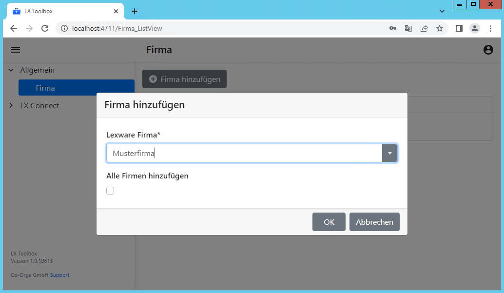 Den dem Klicken auf Firma hinzufügen kann eine Lexware-Firma ausgewählt werden, für die später eine Datenbankverbindung eingerichtet werden soll.