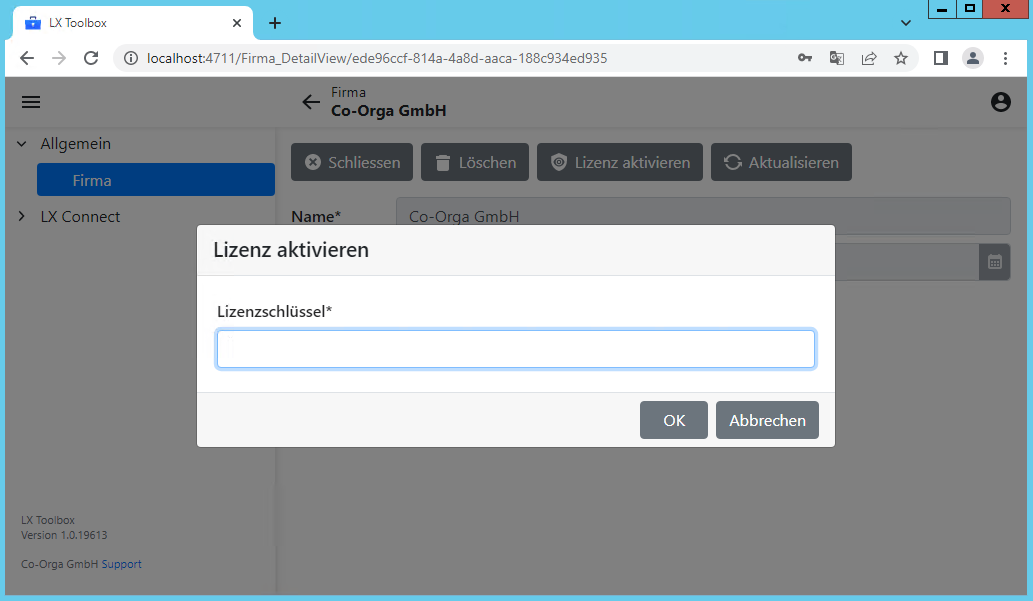 Für alle anderen Firmen kann ein vorhandener Lizenzschlüssel registriert werden. Dazu muss auf die entsprechende Firma geklickt werden. Es öffnet sich dann folgendes Fenster: