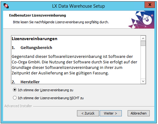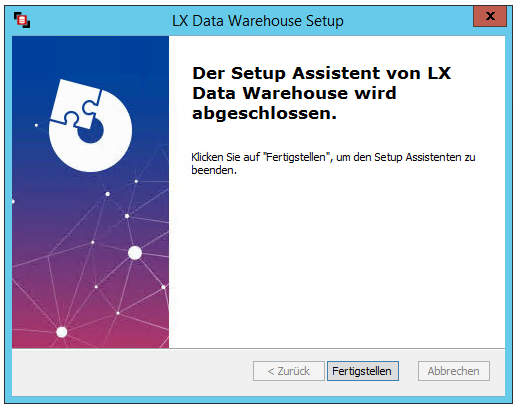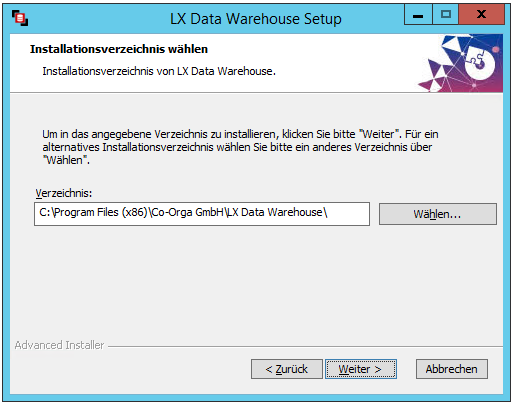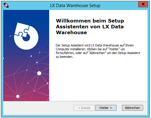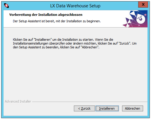 Nachdem die Zieldatenbank eingerichtet ist, kann mit der Installation von LX Data Warehouse begonnen werden.