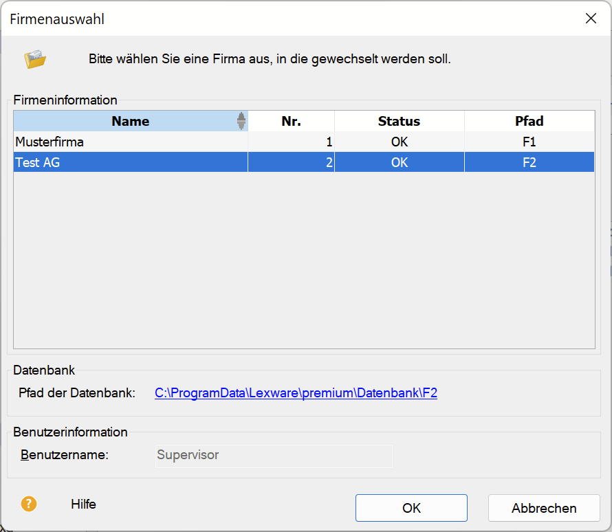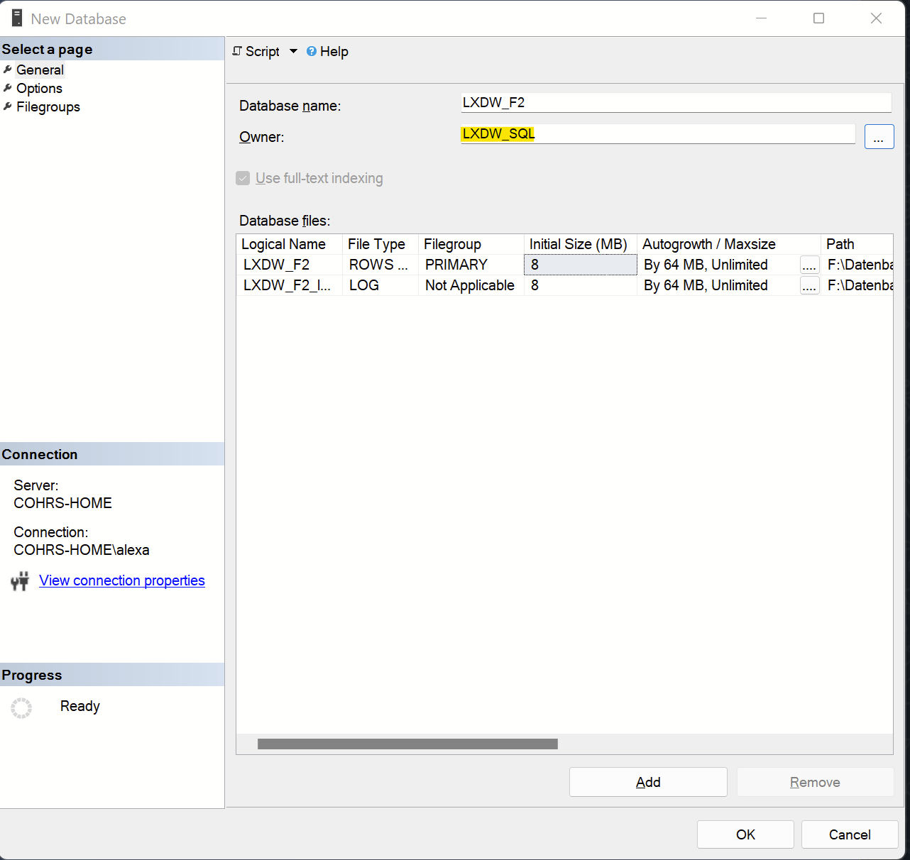 Die Zieldatenbank für die Lexwaredaten muss manuell angelegt werden. Wir empfehlen folgende Konvention “LXDW_F2”, für die Lexware Firma Nr 2.